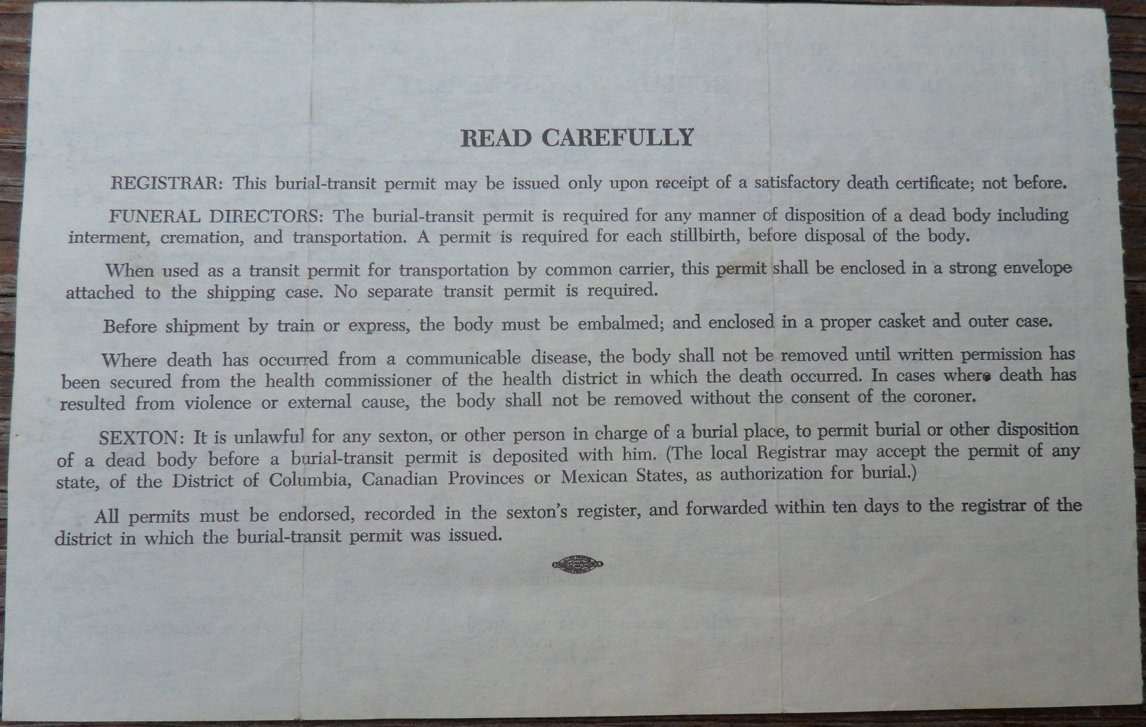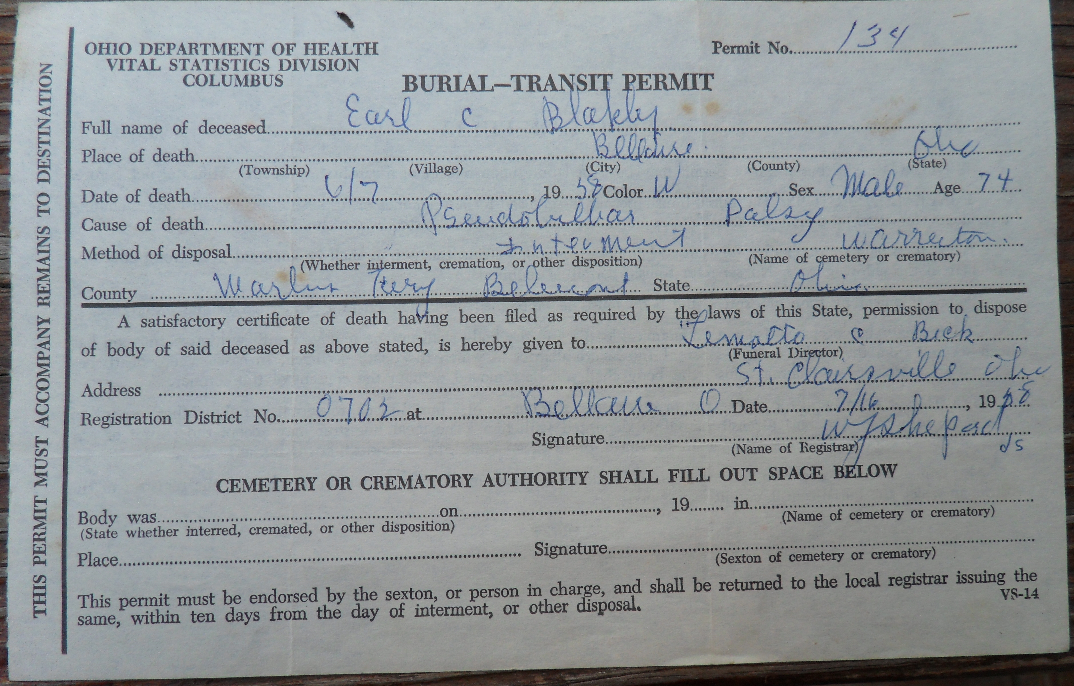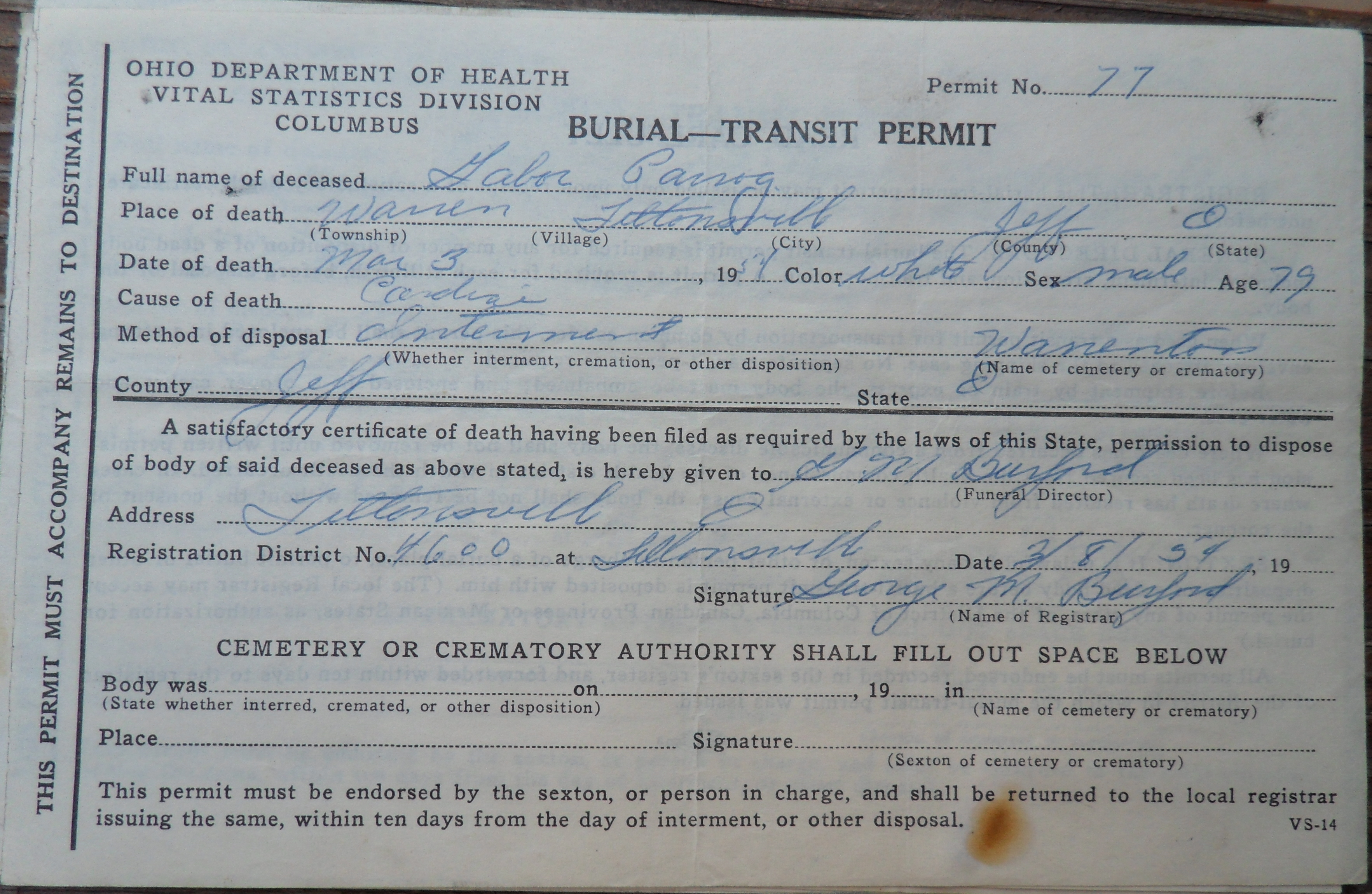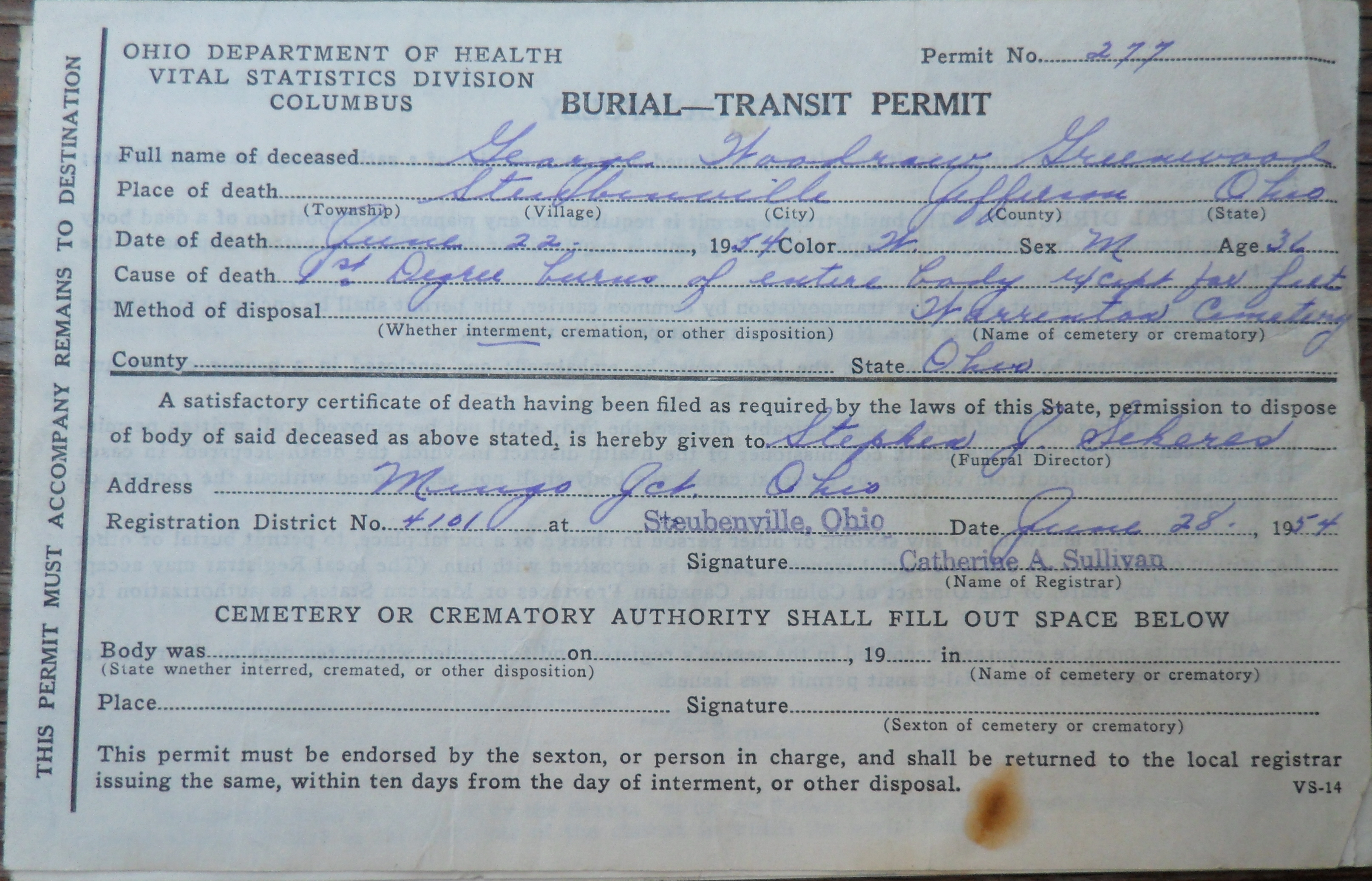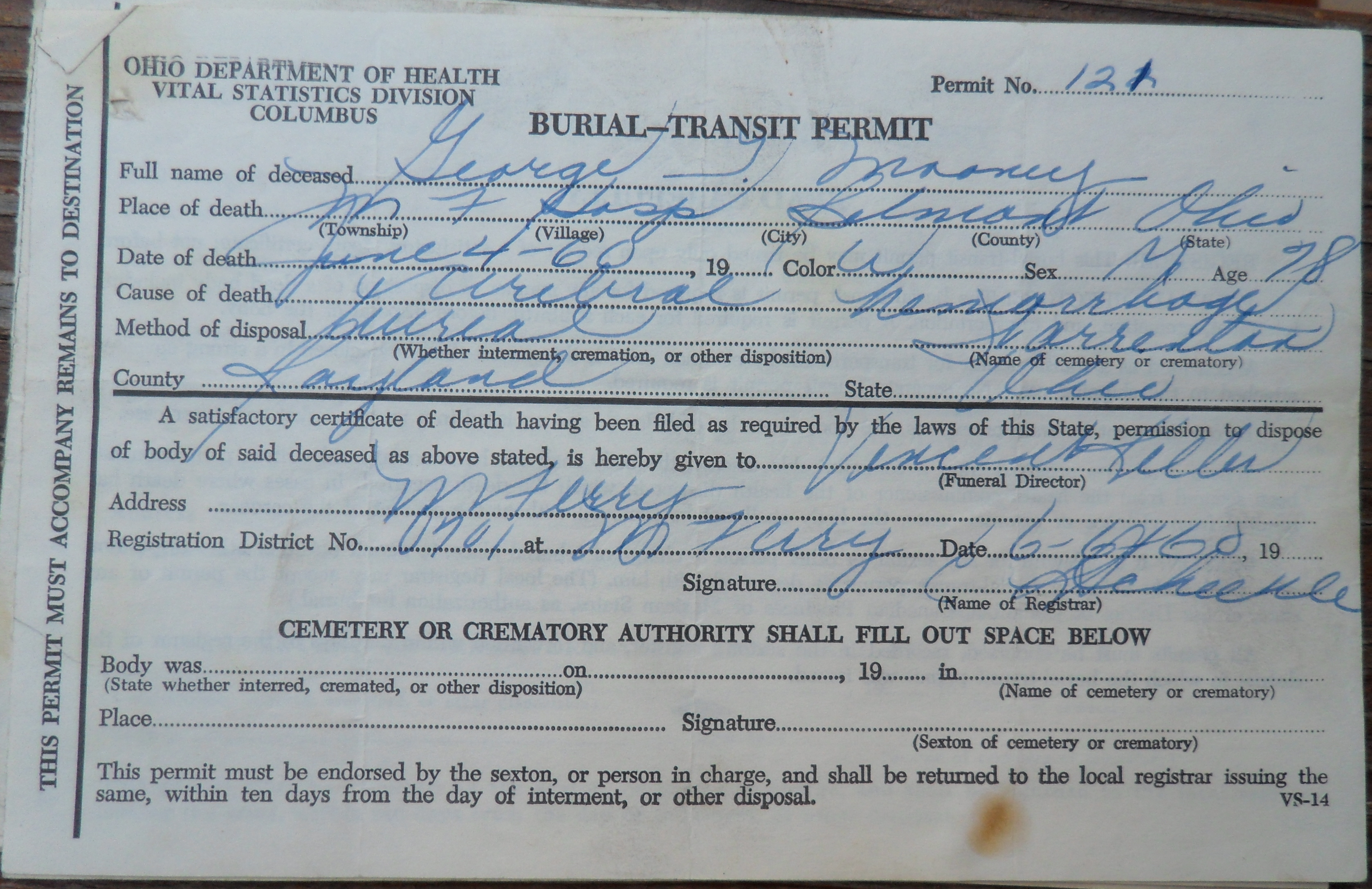 Burial Transit Permit Ohio Back