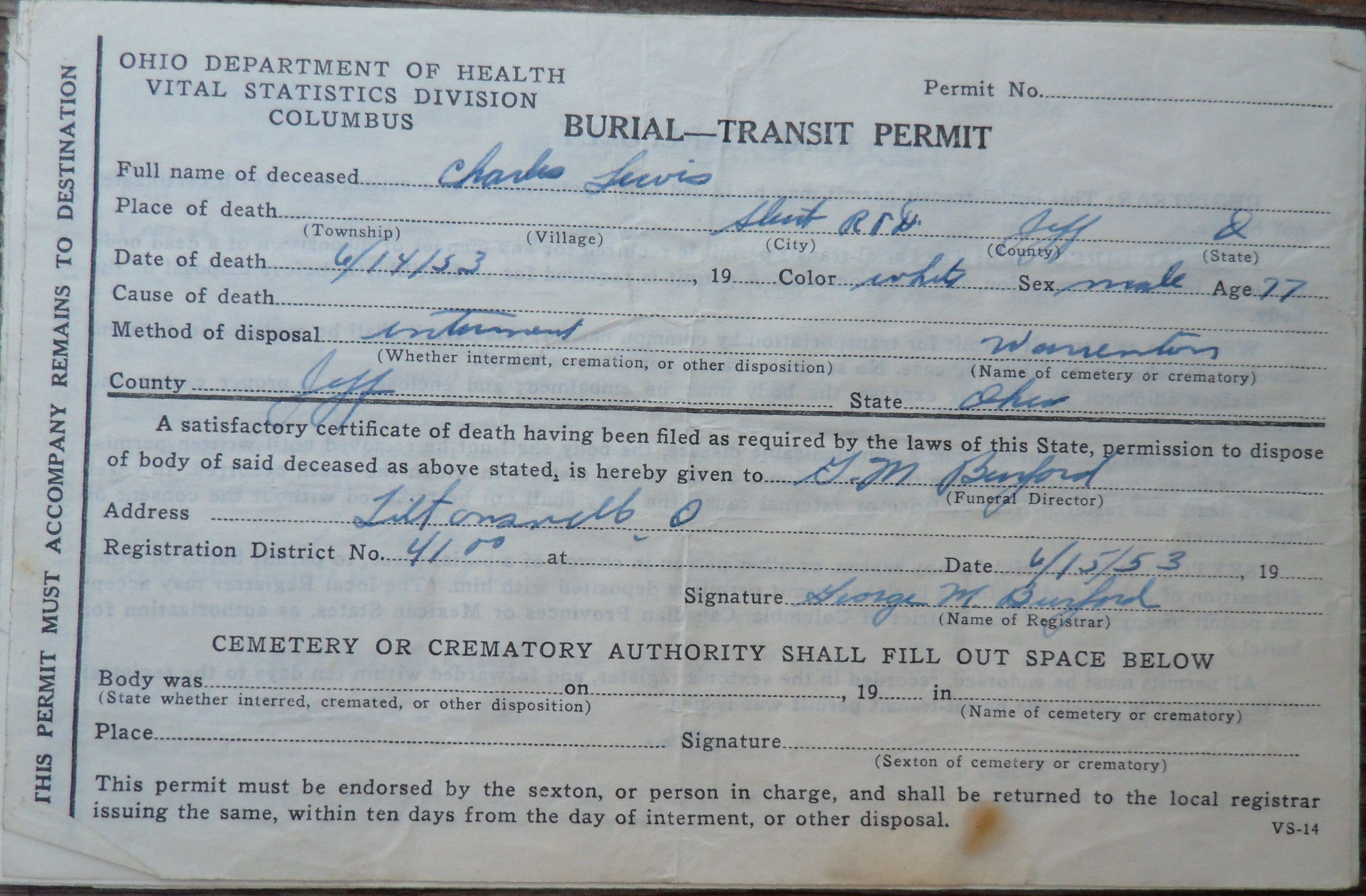 LEWIS, Charles Burial Transit Permit