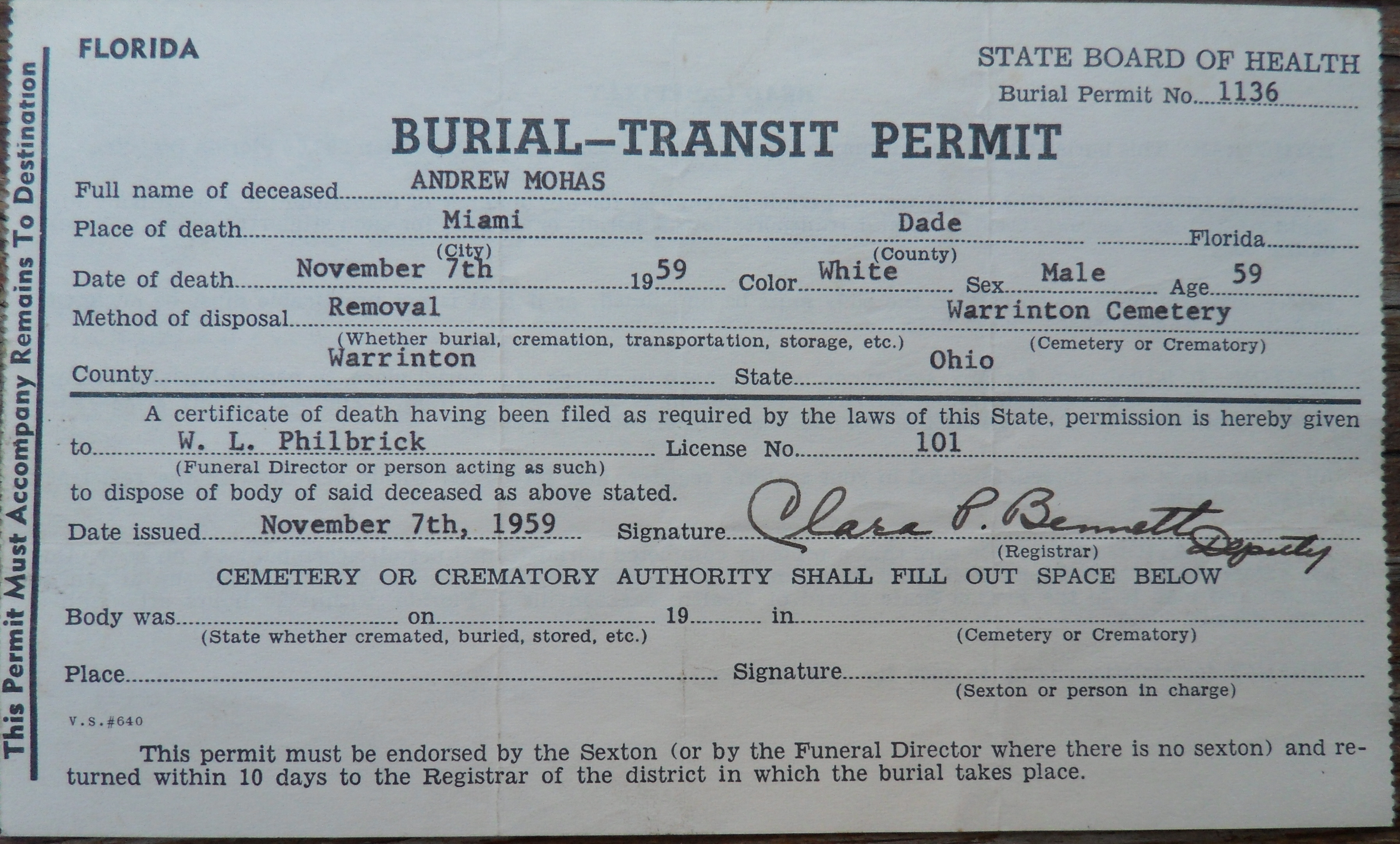 MOHAS, Andrew Burial Transit Permit