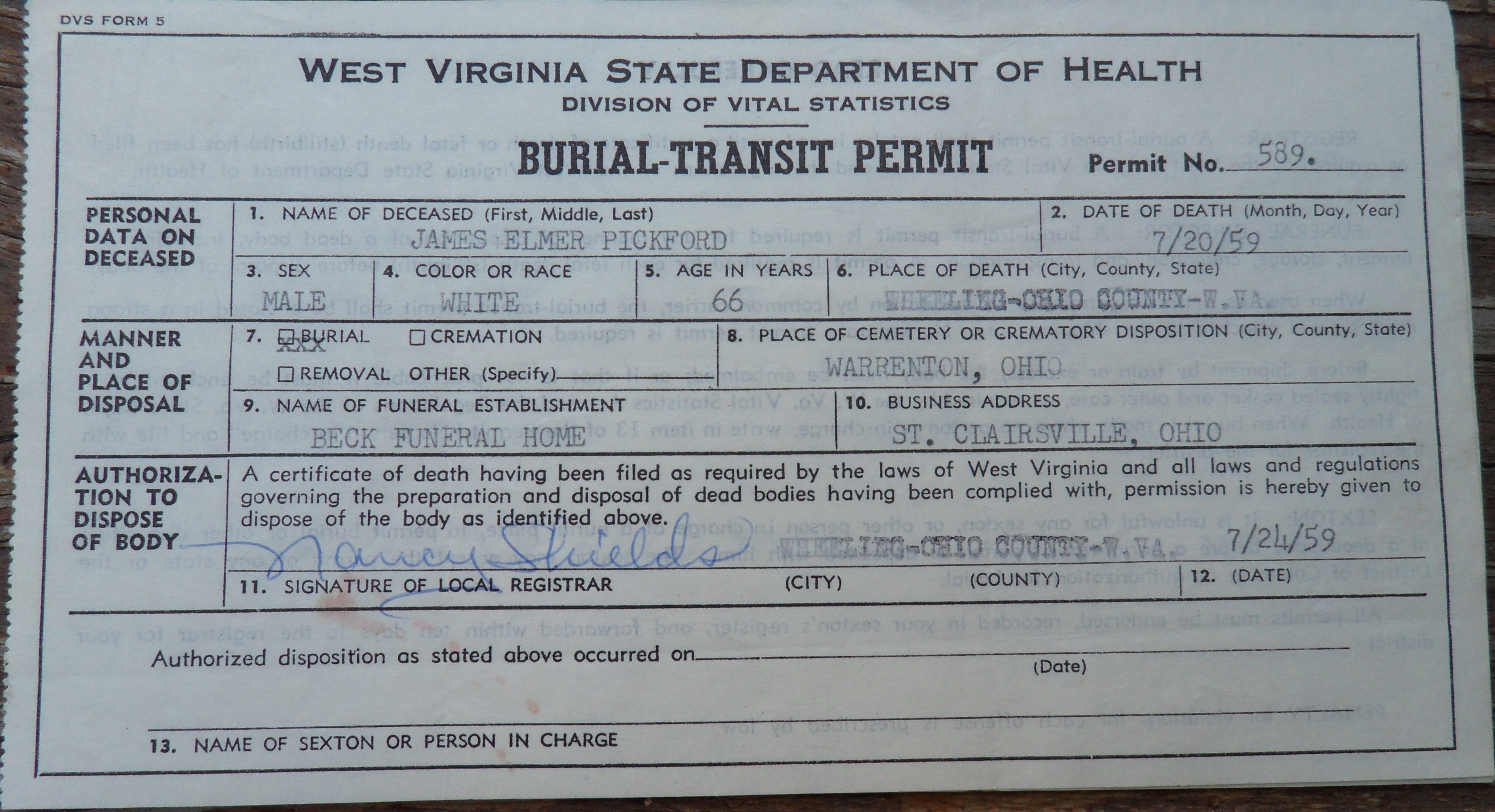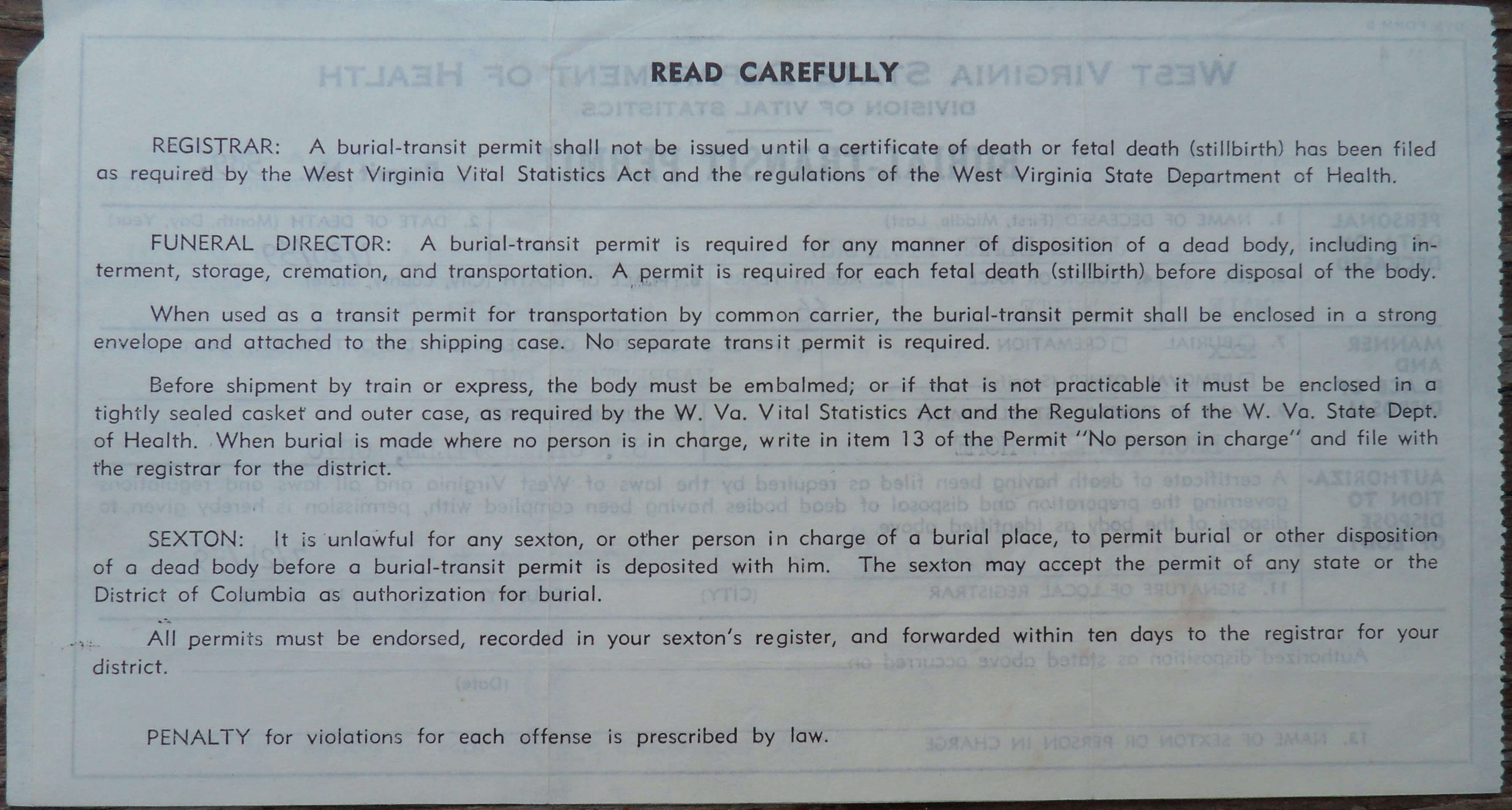 West Virginal Burial or Removal Permit Back