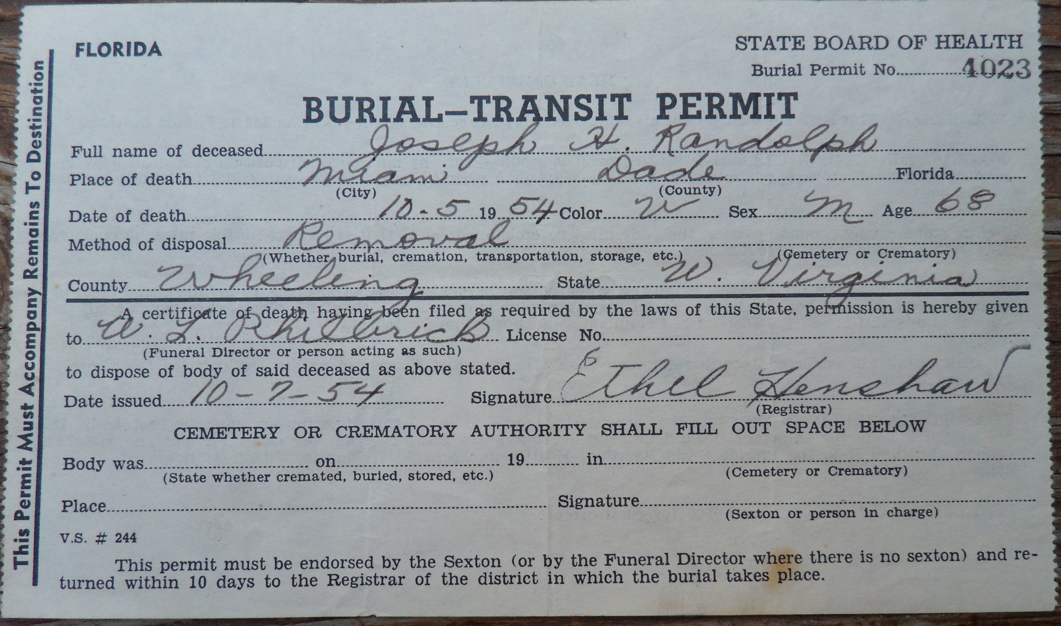 RANDOLPH, Joseph Burial Transit Permit