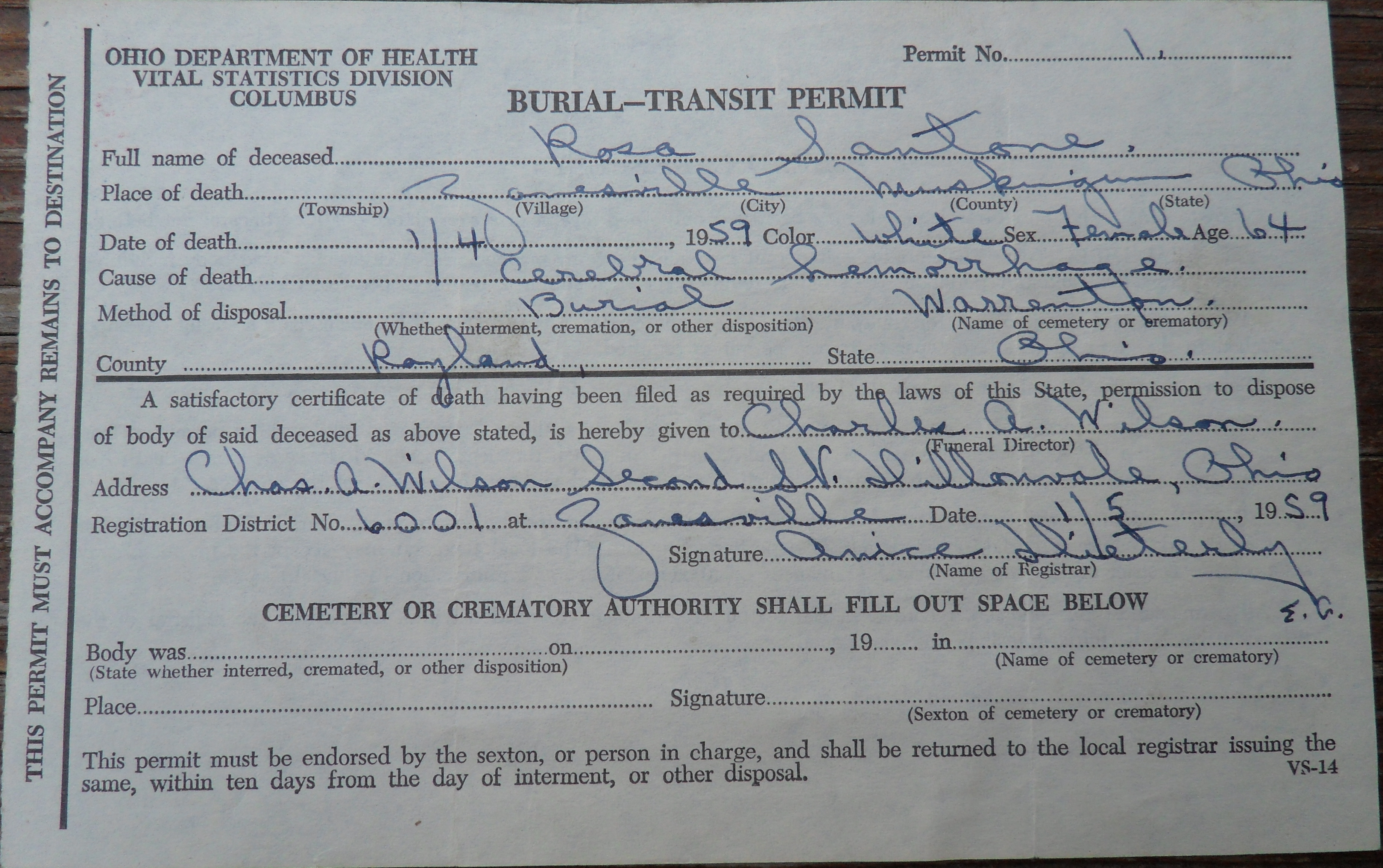 SANTONE, Rosa Burial Transit Permit