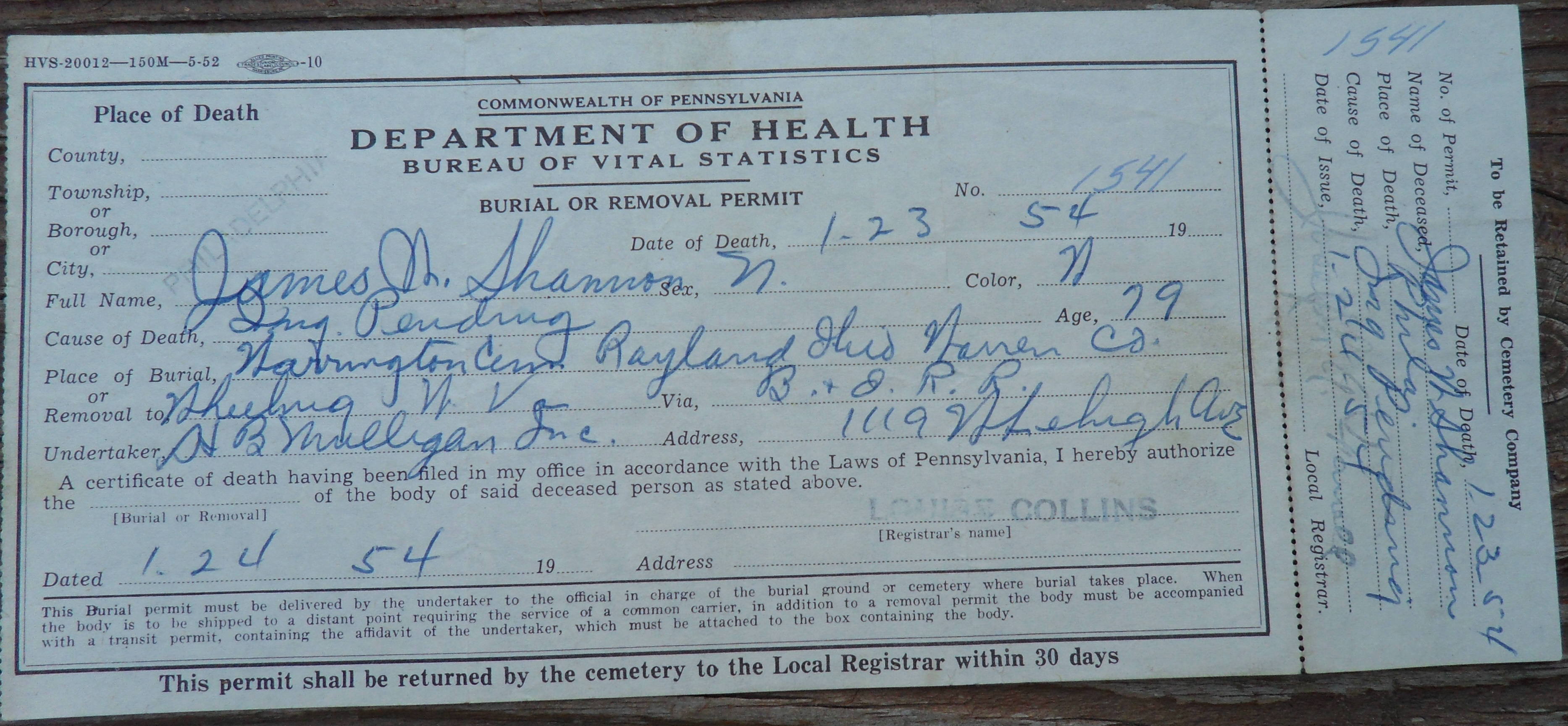 SHANNON, James Burial or Removal Permit Back