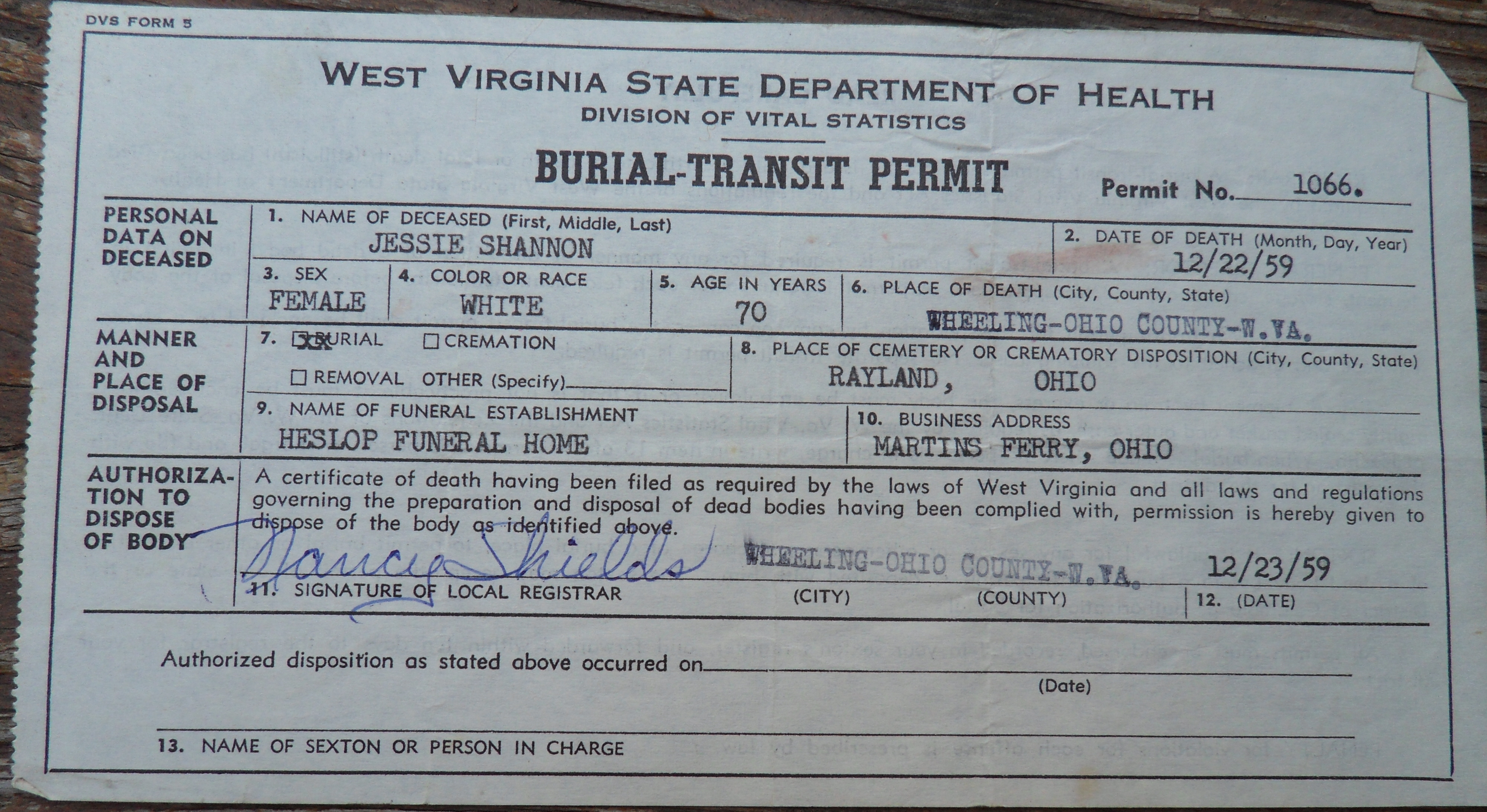 SHANNON, Jessie Burial Transit Permit